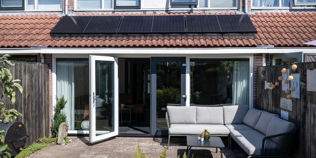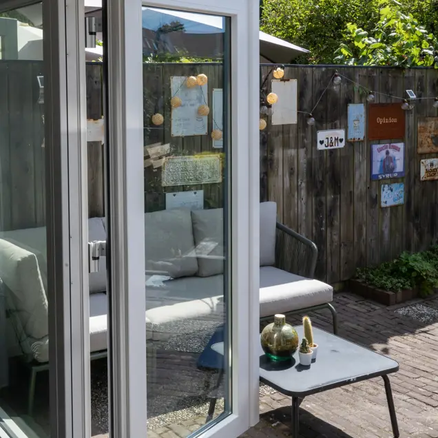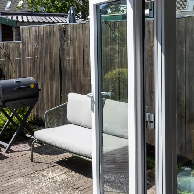 De bewoners van deze woning in Leiden wilden de woonkamer en de tuin met elkaar verbinden. Door een achterpui met openslaande deuren te plaatsen, verbindt u de ruimten aan elkaar.