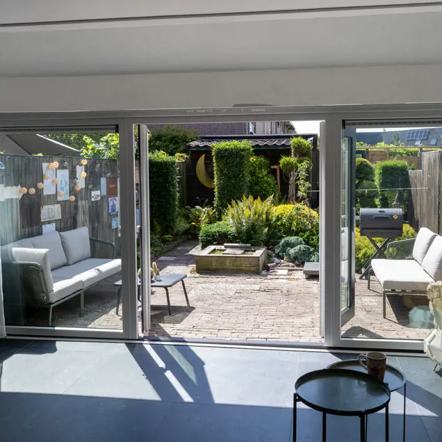 De bewoners van deze woning in Leiden wilden de woonkamer en de tuin met elkaar verbinden. Door een achterpui met openslaande deuren te plaatsen, verbindt u de ruimten aan elkaar.