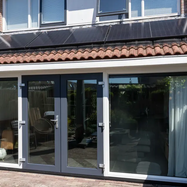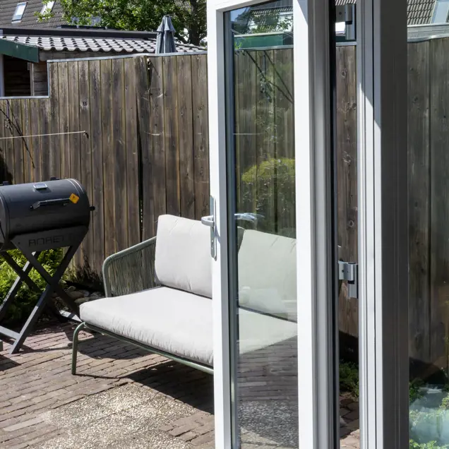 Aan de achterkant van deze woning in Leiden plaatsten wij twee openslaande deuren naar de tuin. De deuren draaien open naar buiten en de grote glazen ruiten zorgen ervoor dat de woonkamer met de tuin verbonden is. Ook zorgt het kozijn voor veel lichtinval en oogt de woning een stuk ruimer.